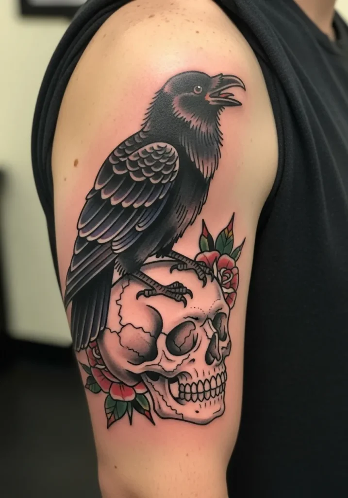 This American Traditional tattoo shows a black raven perched on a skull surrounded by red and green flowers. It’s inked on the upper arm, giving it a powerful and balanced look. The design mixes thick black lines, smooth shading, and pops of color that bring the flowers and bones to life against the skin. The size is medium to large, perfect for showing off the details of both the bird and the skull.