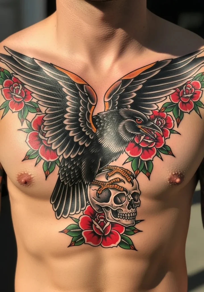 This chest tattoo features a bold raven spreading its wings across the chest, framed by red roses and a skull below its claws. The shading is smooth and dramatic, with crisp outlines and a perfect balance of black, red, and muted orange tones. It’s a large, detailed piece that makes an instant impression.