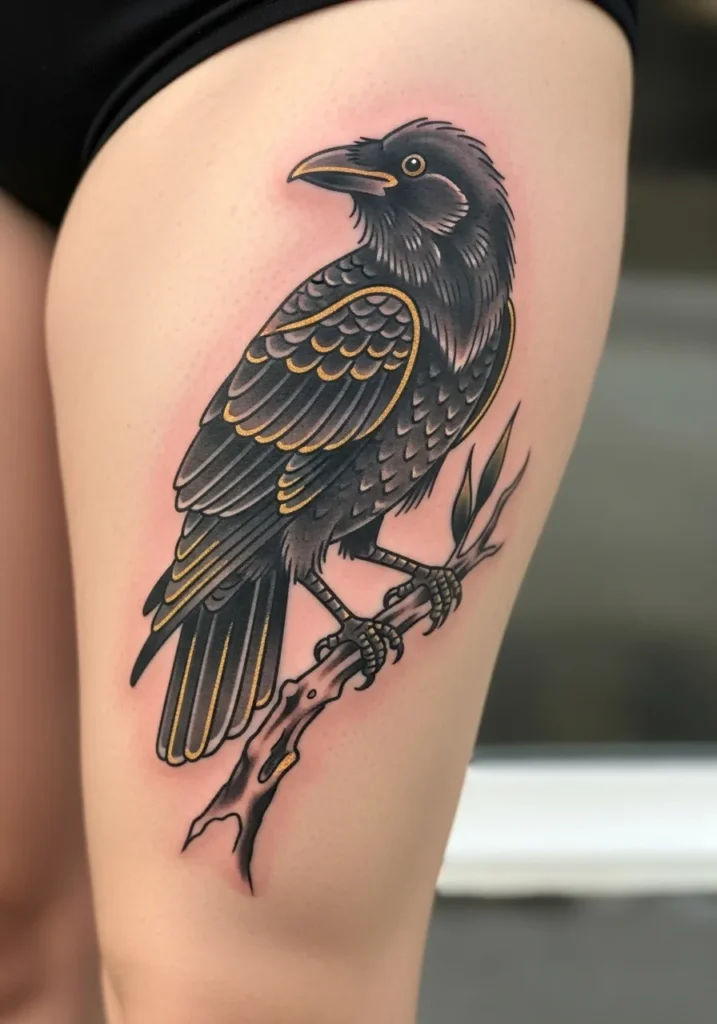 This thigh tattoo shows a calm, elegant raven perched on a branch, detailed with golden highlights that shine beautifully against the black ink. The shading is smooth, and the placement on the thigh gives it a graceful vertical flow. It’s a medium-sized piece that feels both bold and refined.