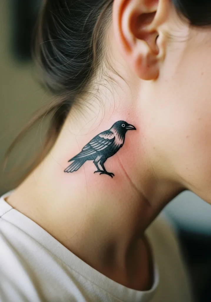 This small neck tattoo features a minimalistic raven design placed delicately on the side of the neck. The shading is subtle, and the size makes it feel dainty but full of personality. The placement is bold but still stylish, especially with how neatly it hugs the curve of the neck.