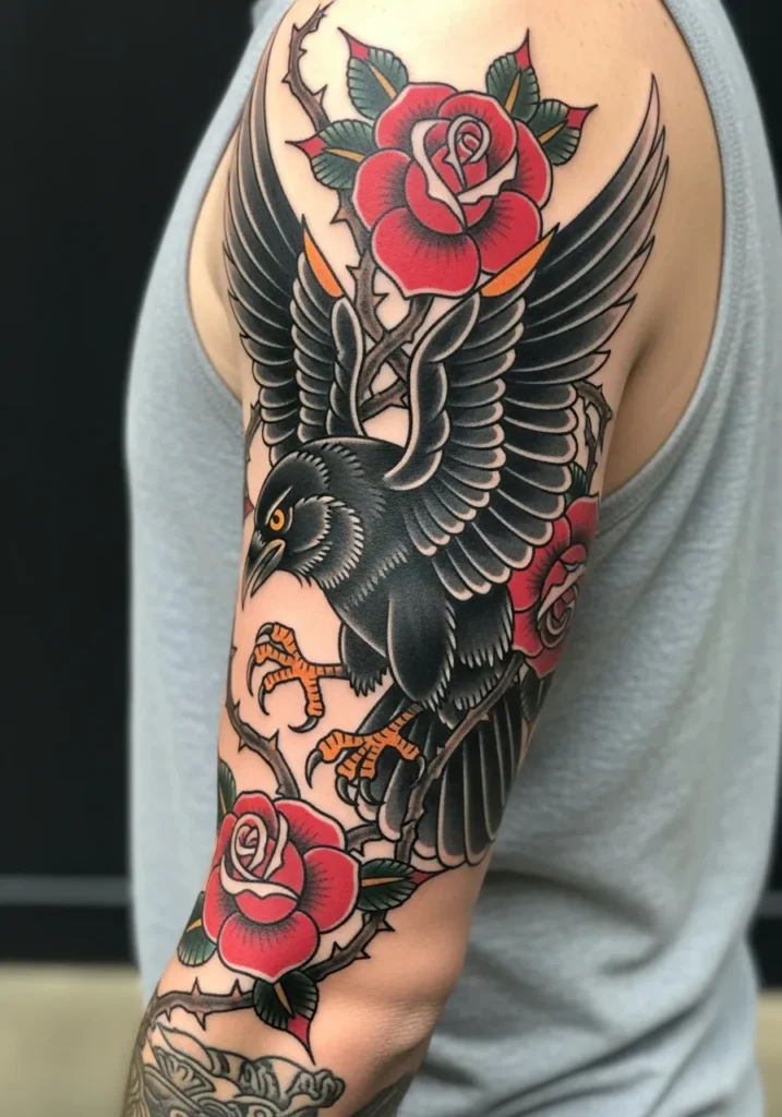 This arm tattoo shows a dynamic raven mid-flight, surrounded by blooming red roses and deep green leaves. The strong black lines and bright colors make it classic American Traditional perfection. The design fills the arm nicely, creating a balanced and eye-catching half-sleeve effect.