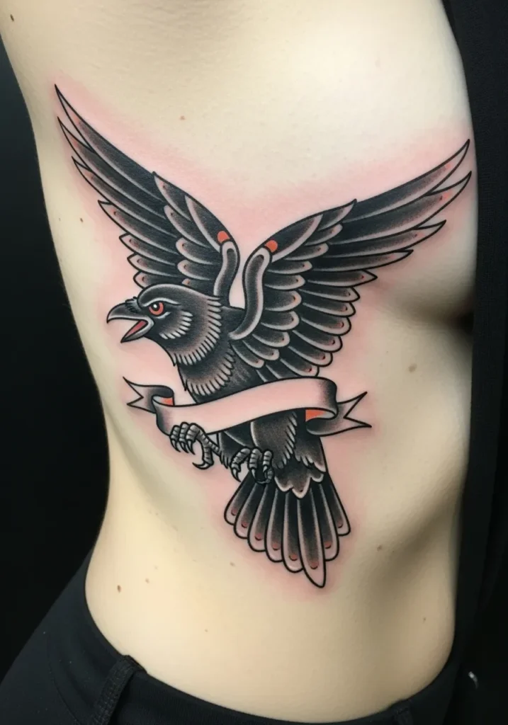 This rib tattoo features a soaring raven holding a blank banner in its claws, leaving space for a name, word, or phrase. The black and gray shading is soft yet bold, with a few orange details that add warmth to the overall look. The rib placement makes it sleek and slightly hidden, adding to its mystery.