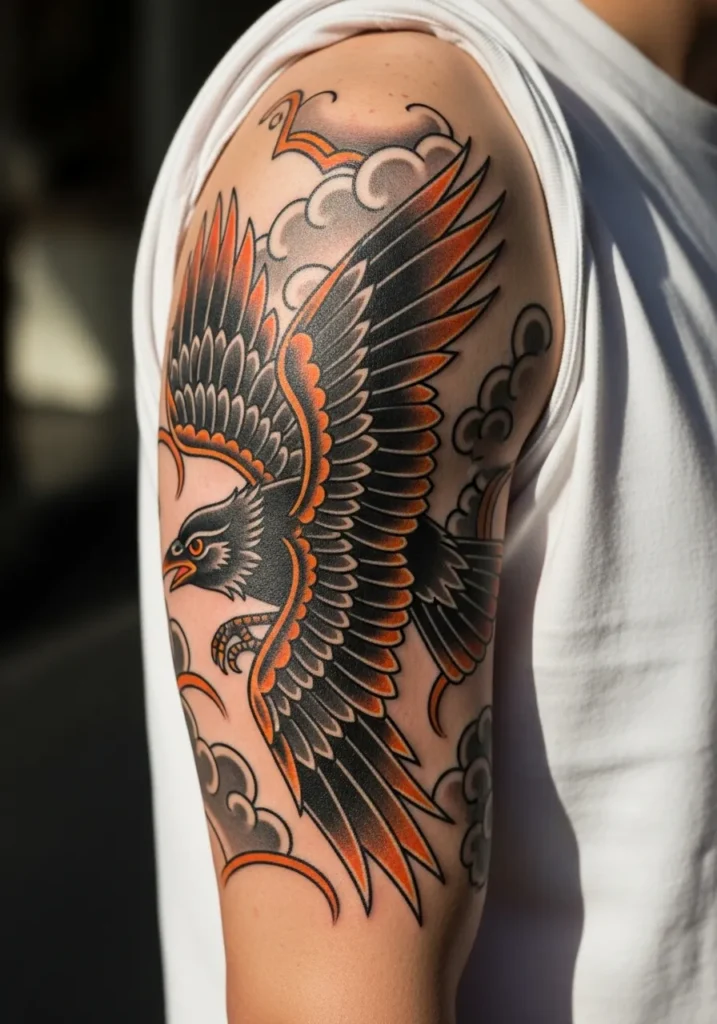 This bold upper arm tattoo features a striking raven mid-flight surrounded by swirling clouds. The design pops with deep blacks and vivid orange shading that creates an almost glowing effect along the wings and feathers. The American Traditional style shines here with its clean lines and powerful contrast, making it an ideal medium-sized statement piece.
