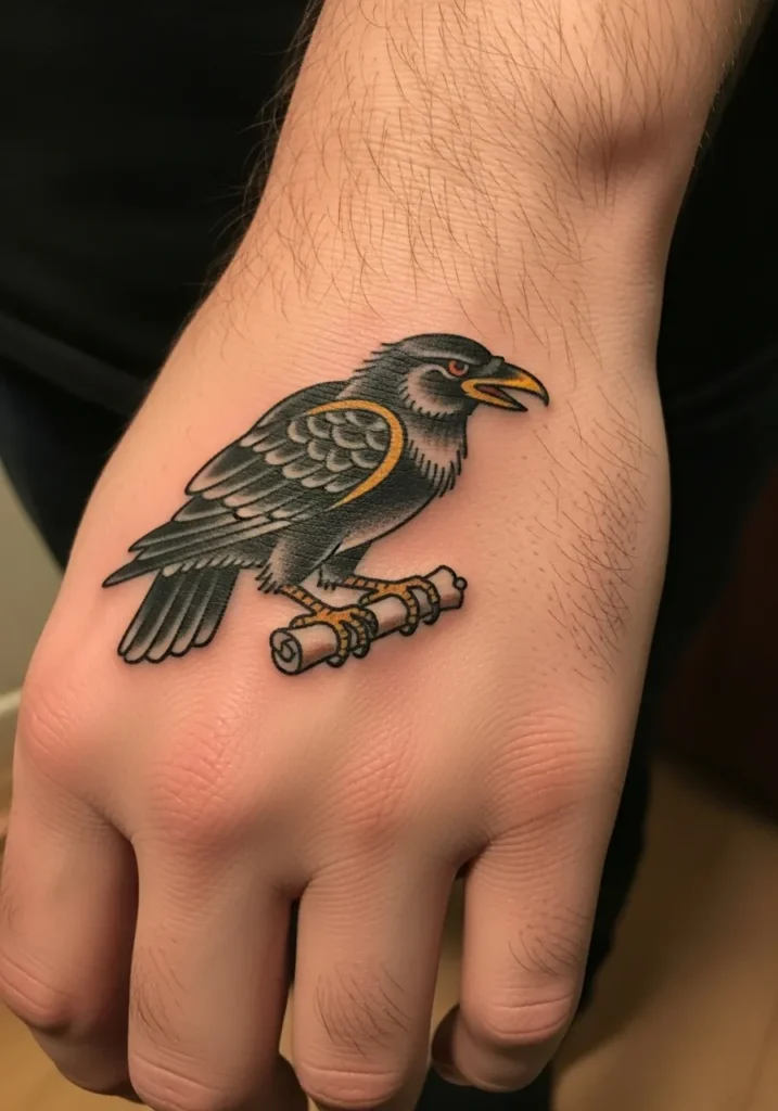 This small tattoo sits perfectly on the top of the hand, showing a raven perched on a small scroll. The shading is soft yet bold, with golden details that highlight the wings and beak. The design fits naturally with the hand’s shape, making it both subtle and expressive.