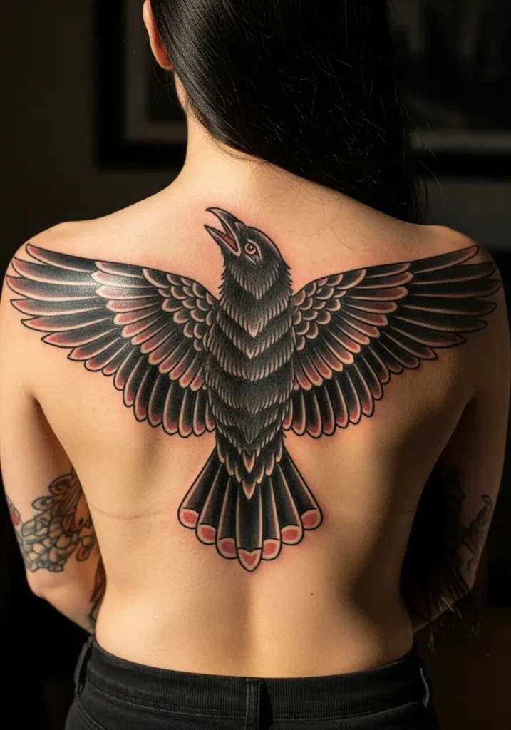This large back tattoo features a beautifully symmetrical raven with its wings spread wide, covering the upper back from shoulder to shoulder. The deep blacks fade into soft pink tones that highlight each feather, giving the piece stunning dimension. It’s the perfect example of American Traditional boldness with a refined touch.