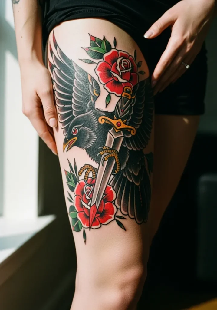 This thigh tattoo showcases a detailed raven gripping a dagger, framed by bright red roses and green leaves. The mix of bold black ink with vibrant reds and gold touches gives it that perfect American Traditional look. The size and placement make it dramatic but still elegant, wrapping naturally around the thigh.
