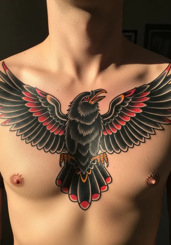 This chest tattoo shows a majestic raven with wings spread across the chest, using rich blacks and red highlights that make the design glow beautifully. The composition fits the chest perfectly, with the wings following the collarbones in a natural flow. The style is unmistakably American Traditional, with crisp lines and dynamic shading.
