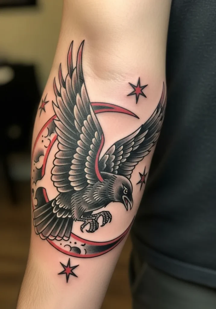 This forearm tattoo pairs a raven in flight with a red crescent moon and stars around it. The sharp black and red palette gives it an old-school cosmic feel, with every feather and curve carefully shaded for a sense of motion. The composition fits the arm beautifully, wrapping just enough to follow the natural lines of the muscle.