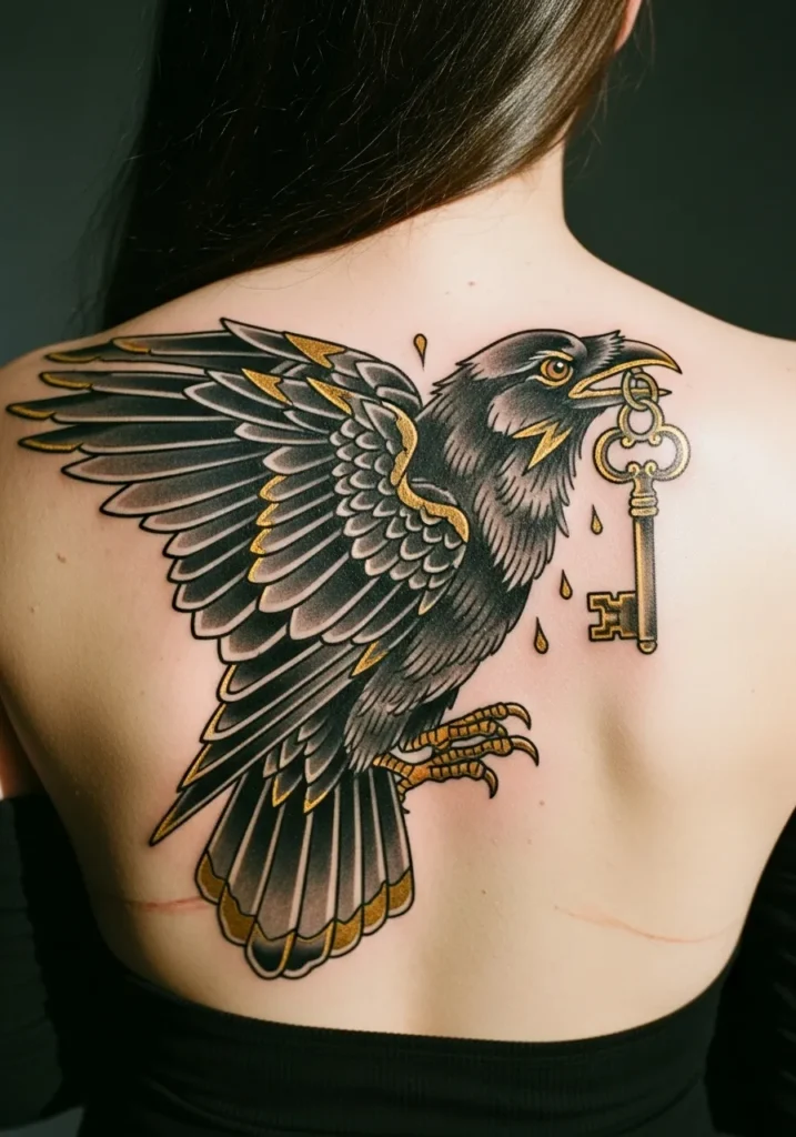 This large back tattoo shows a majestic raven mid-flight, clutching an antique golden key in its beak. The detailing on the feathers is incredible, with gold accents that shimmer beautifully against the black ink. The composition spreads across the upper back, making it a true statement piece full of power and motion.