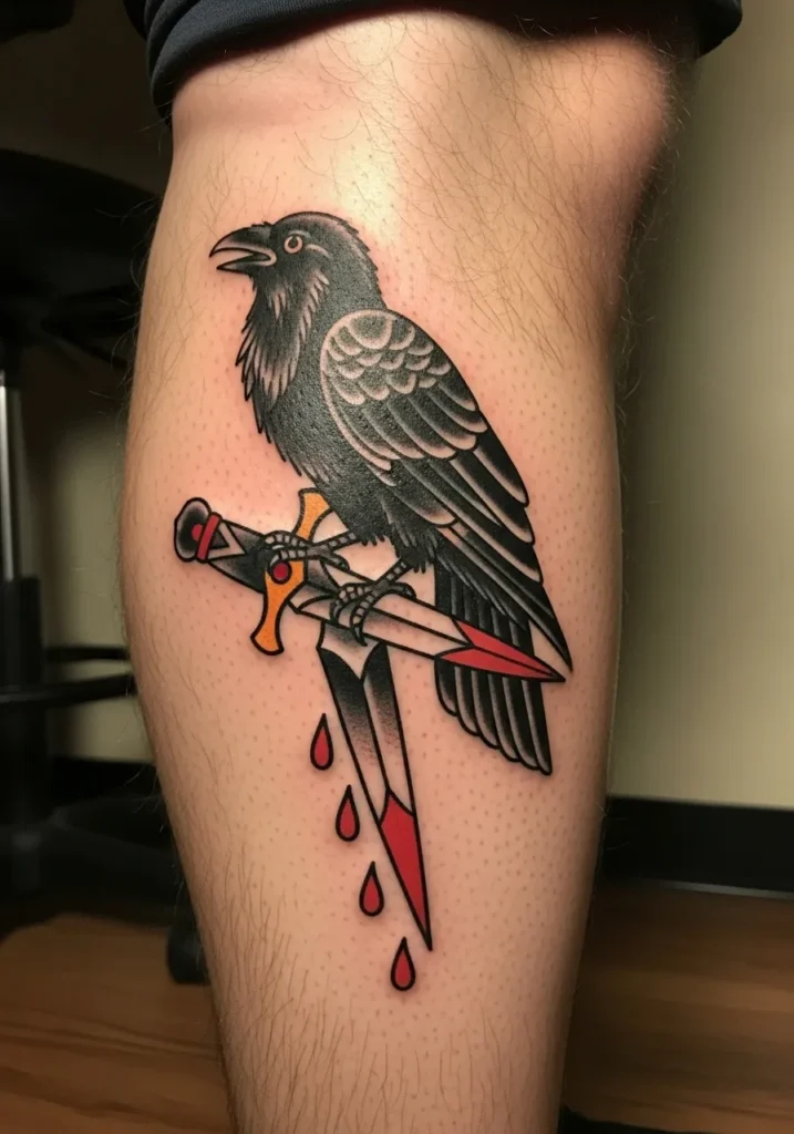 This calf tattoo features a raven perched firmly on a dagger dripping with bright red blood drops. The American Traditional style shines through in the solid linework, clean gradients, and high contrast colors. The placement on the leg works perfectly for the vertical flow of the design, making it look fierce and balanced.