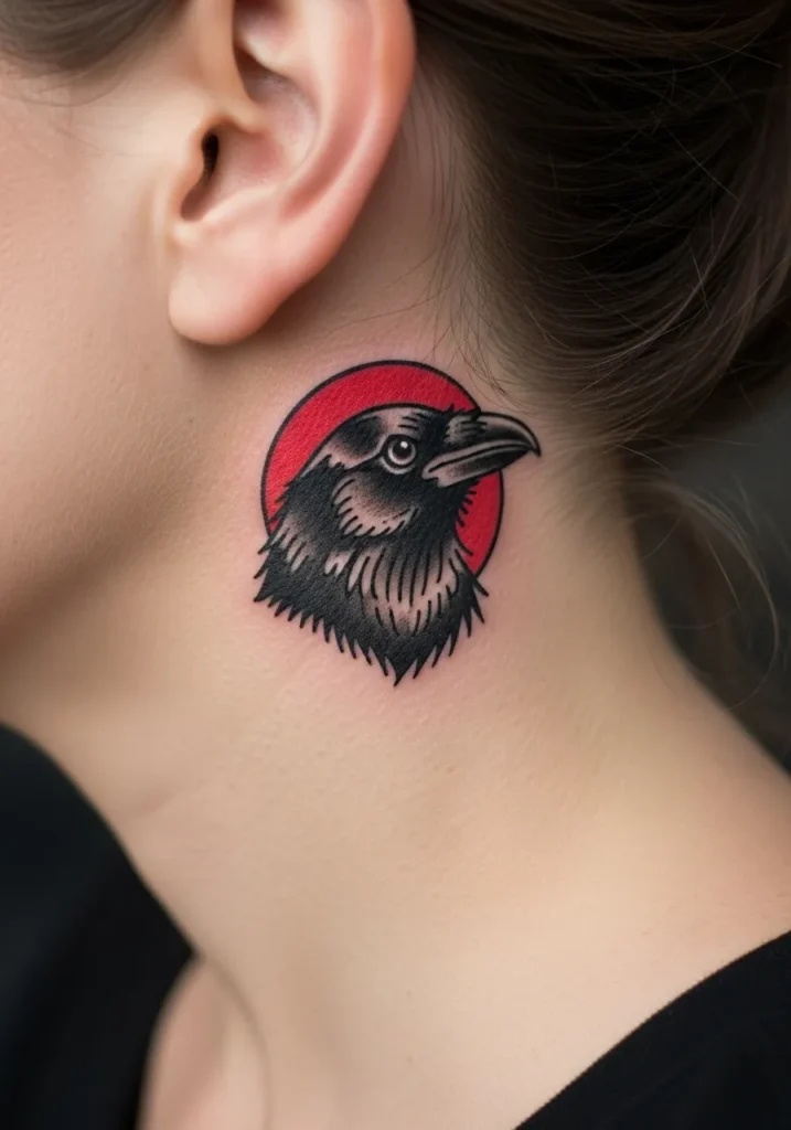 This tiny neck tattoo shows the head of a raven framed by a bold red circle. The contrast of black and red makes it pop instantly, while the small size keeps it sleek and elegant. It sits just behind the ear, which is such a confident and unexpected placement.