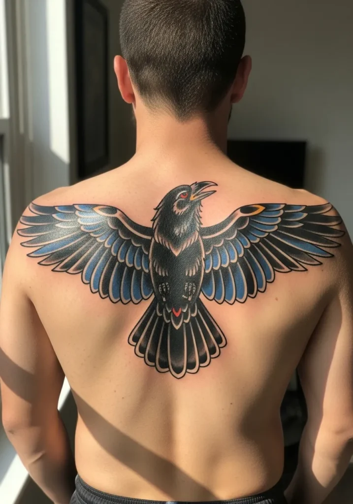 This back tattoo shows a wide-winged raven stretched across the shoulders, done in a bold American Traditional style. The feathers are deep black with rich blue accents that catch the light beautifully. The lines are clean and strong, and the design flows naturally across the back, making it feel powerful and perfectly balanced.
