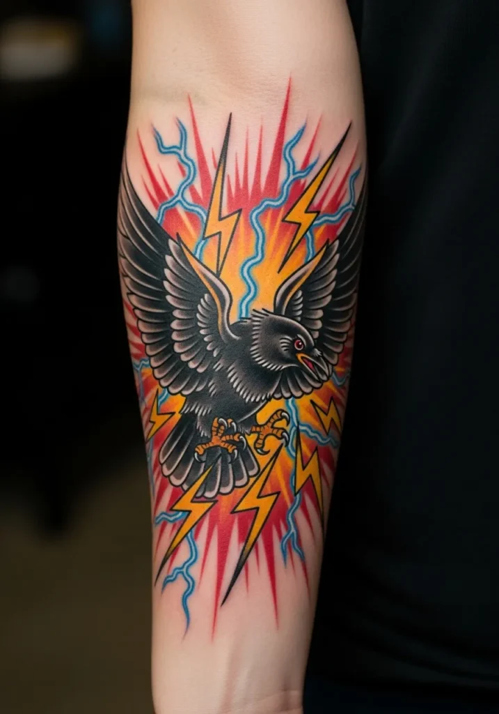 This forearm tattoo bursts with energy, showing a fierce raven surrounded by lightning bolts and vivid flashes of orange, yellow, and blue. The American Traditional style keeps the structure bold and graphic while the colors bring it to life. It’s a medium-sized piece that sits perfectly on the forearm, showing off that mix of power and chaos.