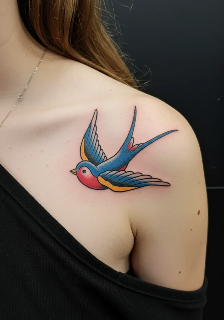 This charming American traditional swallow tattoo rests beautifully on the upper shoulder. It’s medium in size, with crisp black outlines and a bold mix of blue, yellow, and red tones that give it that nostalgic sailor-tattoo flair. The placement follows the curve of the collarbone, making it flow naturally with movement and posture.