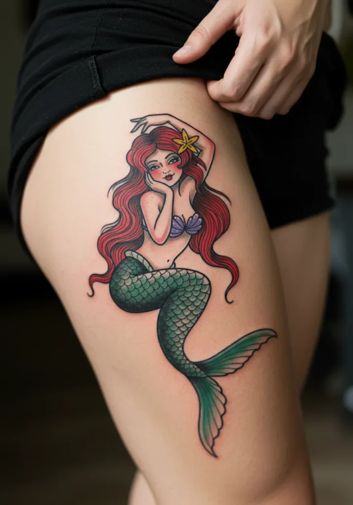 This vintage-style mermaid tattoo flows beautifully across the thigh. Her long red hair curls gracefully down her back, while her green-scaled tail shimmers with perfect shading. The purple seashell top and yellow starfish accent add extra pops of color, making it a gorgeous nod to old-school sailor tattoos.
