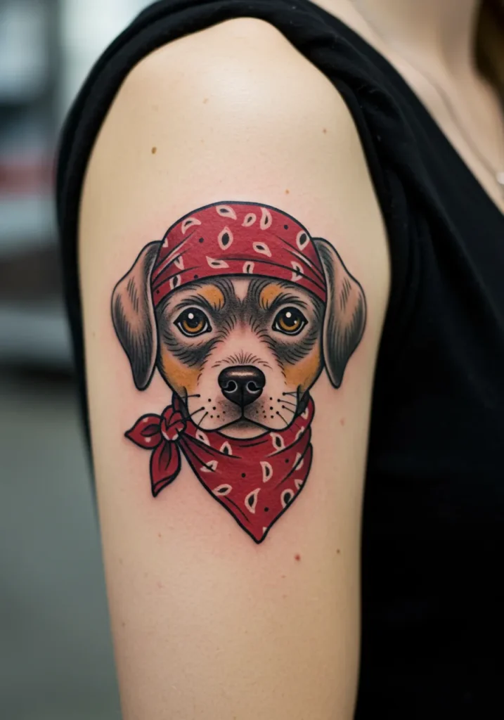 This playful tattoo features a dog wearing a red bandana and matching head wrap, detailed with soft shading and expressive eyes. The design sits proudly on the upper arm, giving off that traditional American tattoo look with its bold lines and warm tones.