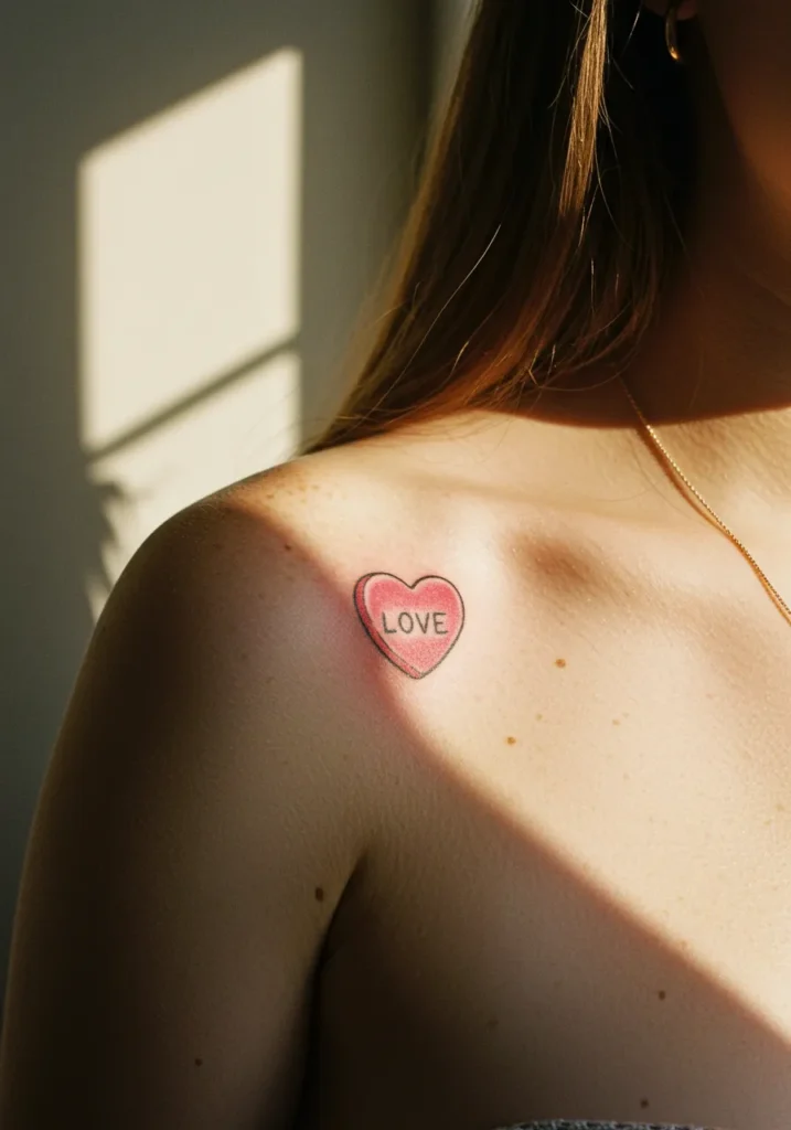 This sweet little heart tattoo rests right above the shoulder bone, filled with a soft pink hue and outlined in black. Inside, the simple word “LOVE” gives it that candy-heart vibe, making it instantly recognizable and classic. It’s small, minimal, and perfectly placed to peek out from under a tank top or dress strap.