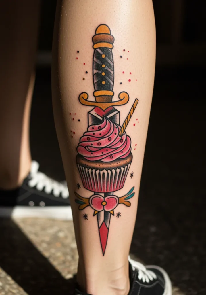 This larger piece sits beautifully on the back of the leg, blending two striking motifs: a cupcake and a dagger. The pink frosting swirls upward around the blade, creating a bold contrast with the deep blacks and yellows of the handle. The design is lively and detailed, filled with tiny dots and spark-like accents that add energy.