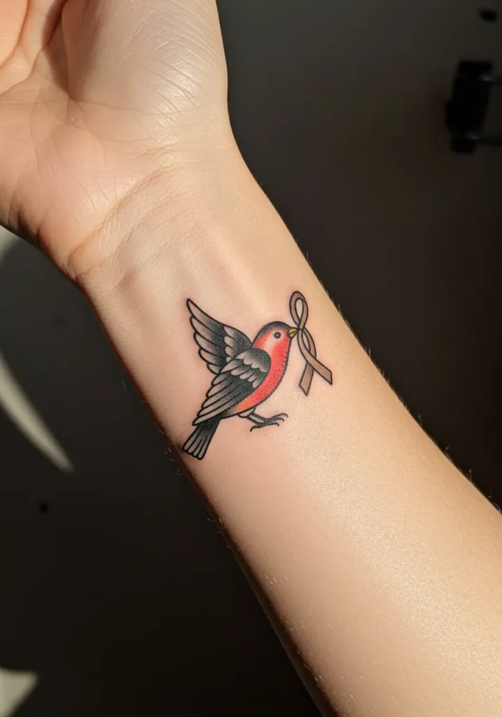 This petite wrist tattoo features a tiny red-breasted bird holding a delicate ribbon in its beak. The shading is soft yet crisp, and the simple color palette of red, black, and gold keeps it firmly rooted in traditional tattoo style. The placement on the inner wrist makes it feel gentle and personal.