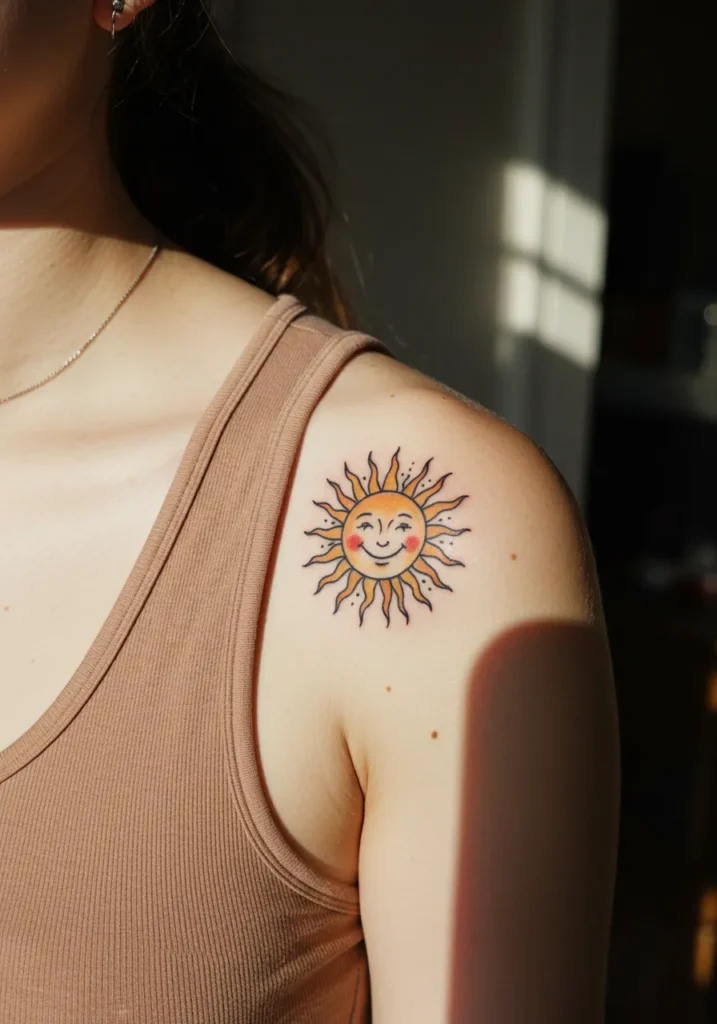 This cheerful little sun tattoo shines brightly on the upper shoulder, complete with a happy face and soft orange and yellow tones. The design is small and perfectly round, with wavy sun rays outlined in bold black for that true American traditional flair. It’s simple, sunny, and positioned where it naturally catches the light.
