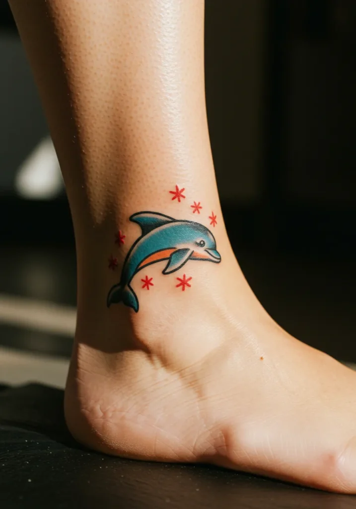 This adorable ankle tattoo features a sleek blue dolphin jumping in mid-air, surrounded by tiny red stars. The clean lines, gradient blues, and subtle shading give it that classic old-school look while keeping it full of fun and movement. It’s small but eye-catching, wrapping perfectly around the ankle bone.