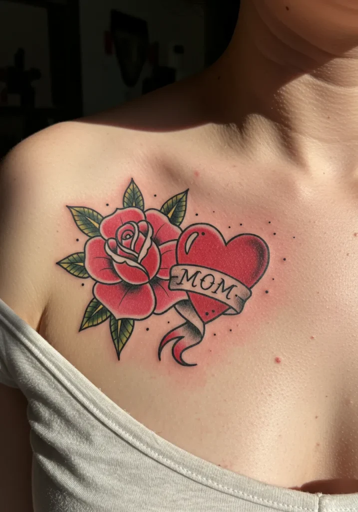 This timeless design sits beautifully on the upper chest, featuring a bold red heart with a banner that reads “MOM,” paired with a traditional red rose. The deep green leaves and dotted shading around the edges give it that vintage sailor tattoo feel. It’s medium-sized and proudly placed, full of old-school character.