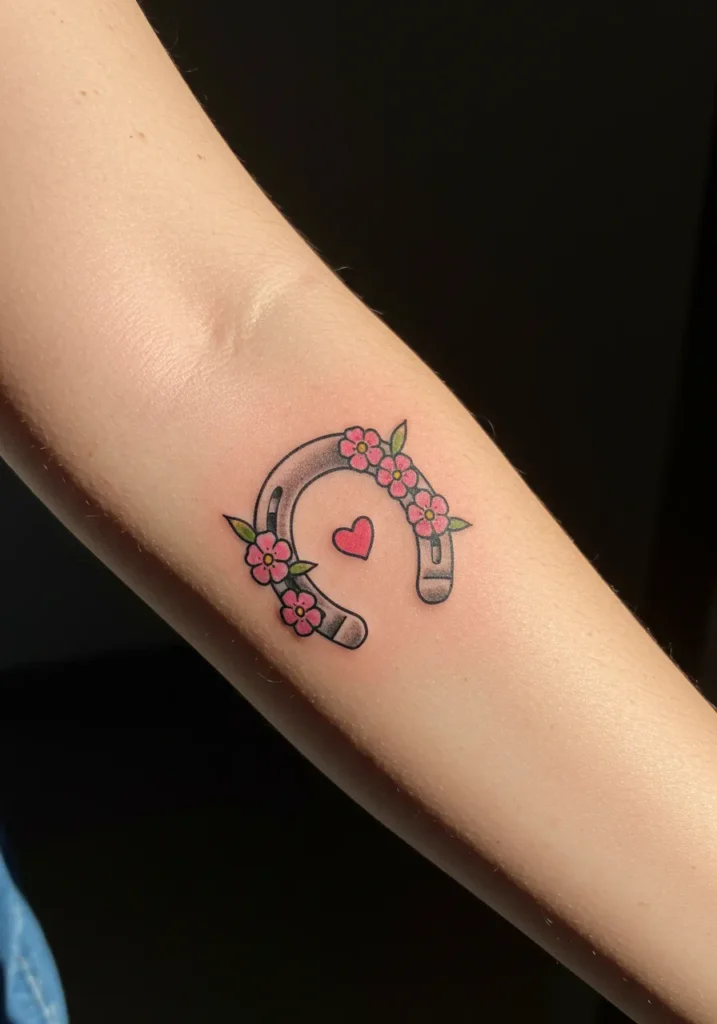 This small and delicate tattoo sits neatly on the outer forearm. A silver horseshoe curves upward for good luck, adorned with pink flowers and a tiny red heart in the center. The crisp outlines and gentle color palette make it a sweet and classic American traditional piece.