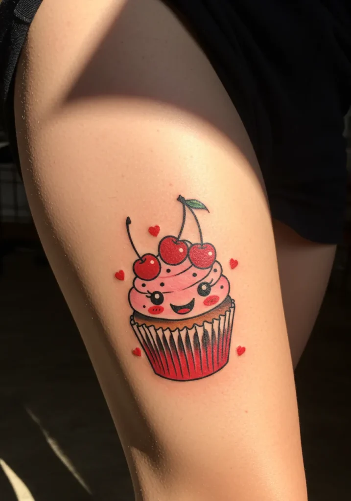 This playful design features a happy pink cupcake topped with cherries and surrounded by tiny red hearts. It’s a small to medium-sized tattoo inked on the upper thigh, glowing in soft natural light. The thick black outlines, glossy highlights, and candy-like colors capture that unmistakable American traditional charm with a modern twist.