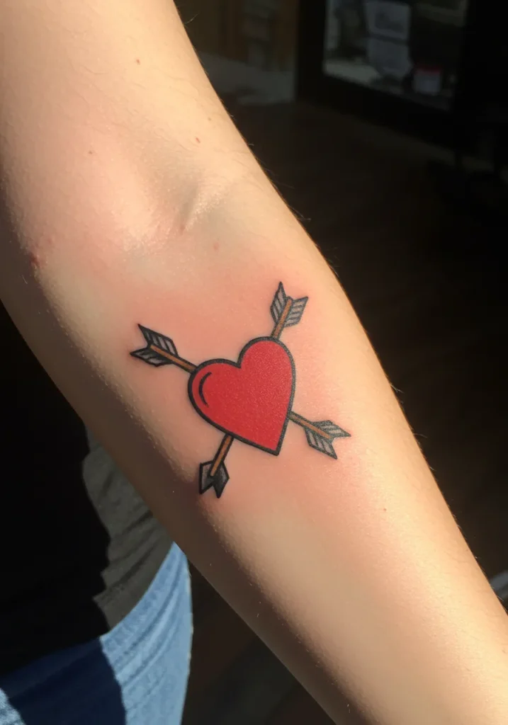 This simple yet striking tattoo features a bright red heart pierced by two arrows, set on the outer forearm. The design is clean and bold, using solid black outlines and vibrant color to give it that unmistakable old-school appeal. It’s medium in size and perfectly balanced in composition.