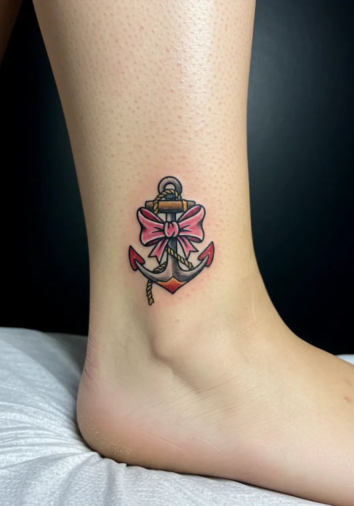 Here’s a cute twist on a classic motif. This small ankle tattoo combines an old-school anchor with a big pink bow tied neatly at the center. The black shading and subtle pops of red and gold add just the right amount of contrast, giving it that nostalgic American traditional balance of bold and feminine.