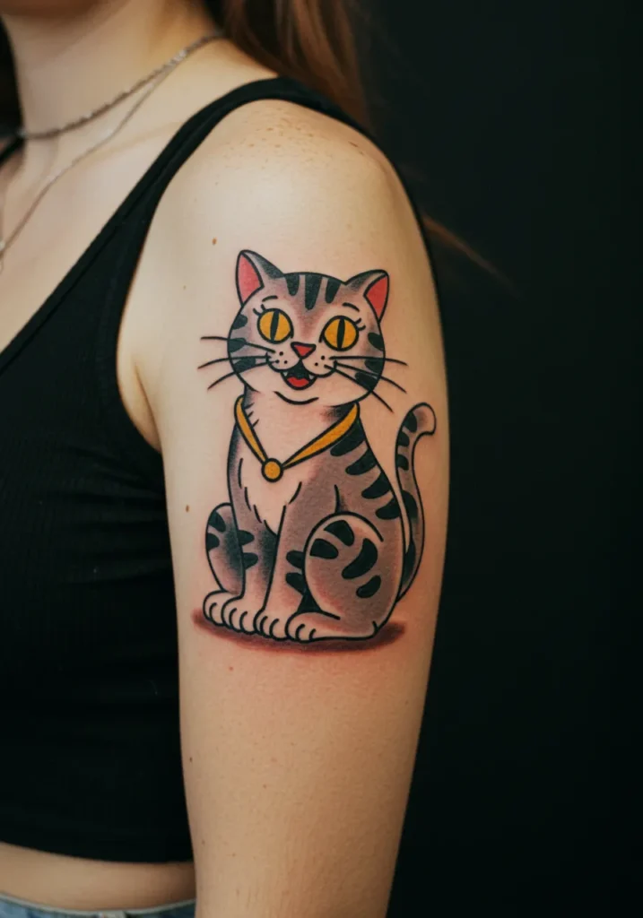 This cheerful cat tattoo sits perfectly on the upper arm, done in the bright and bold style that makes American traditional tattoos so iconic. With its yellow eyes, pink ears, and striped fur, it’s full of charm and personality. The clean lines and classic shading make it stand out beautifully against the skin.