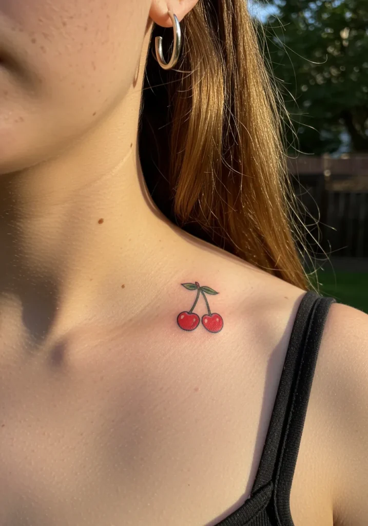 This delicate cherry tattoo rests just below the collarbone, glowing softly in the sunlight. Two shiny red cherries hang from a single green stem, outlined in black for that traditional look. It’s small, perfectly balanced, and positioned in a way that feels both flirty and understated.