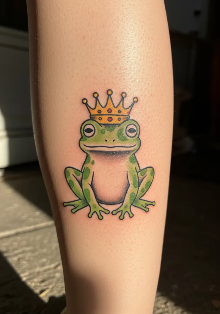 This fun little design features a bright green frog sitting proudly with a golden crown. It’s placed on the calf, medium in size, and bursting with color and charm. The bold outlines and soft shading capture that signature American traditional style while keeping a friendly, storybook feel.