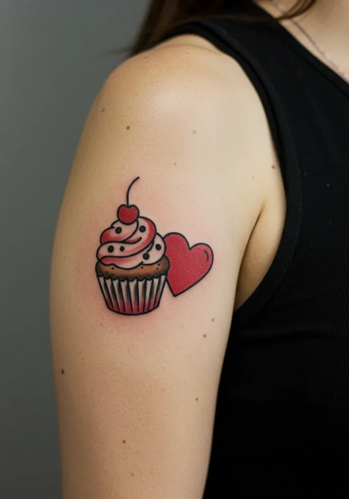 This adorable cupcake tattoo sits on the upper arm, paired with a bold red heart beside it. The frosting swirls in shades of pink and white, topped with a tiny cherry that gives it the perfect finishing touch. The thick black outlines and simple color palette make it a classic American traditional design, full of sweetness and nostalgia.