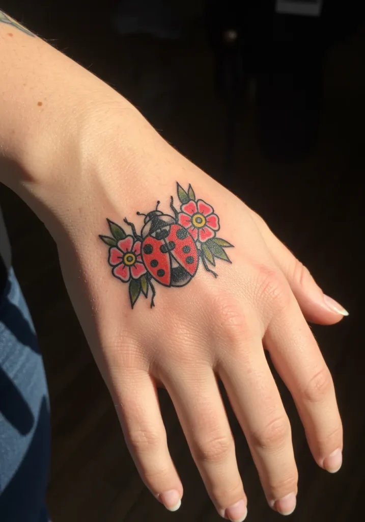 This small ladybug tattoo rests neatly on the top of the hand, surrounded by two pink flowers and lush green leaves. The black and red tones are crisp and vibrant, with perfect symmetry that gives it that timeless American traditional balance. It’s small but detailed, and the placement makes it instantly noticeable.
