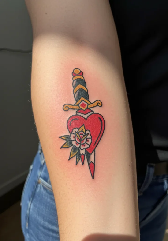 This bold American traditional tattoo features a dagger piercing through a red heart, perfectly placed on the upper arm. The piece is medium-sized with a classic color palette of deep red, gold, and black, and a small rose accent at the base of the blade. The clean lines, solid fill, and crisp shading make it pop beautifully against the skin, with a touch of redness showing it’s freshly done.