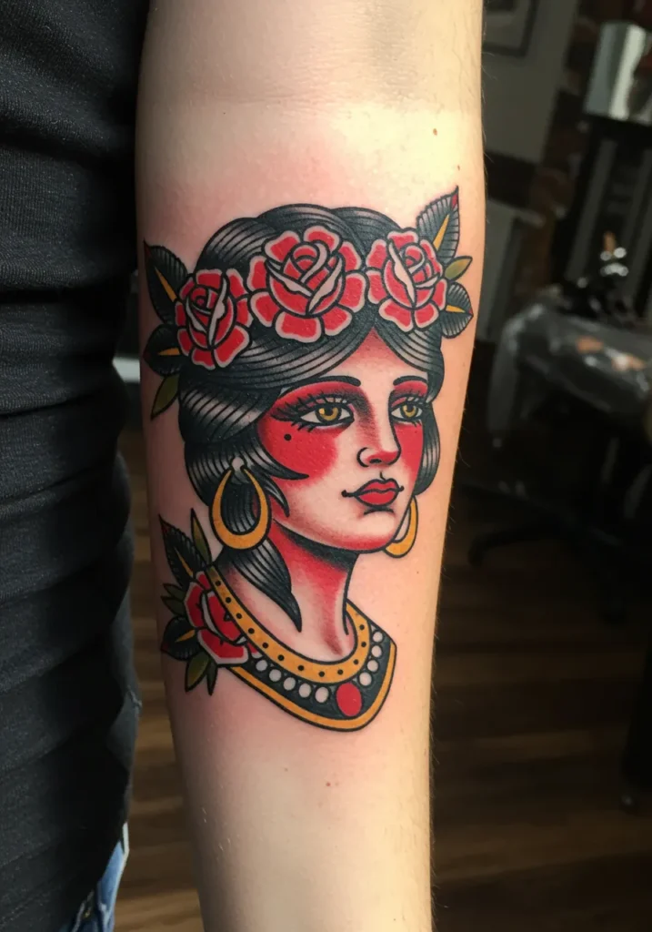 This tattoo features a beautiful woman’s portrait on the forearm, framed by roses in her hair and gold jewelry that pops against her dark locks. The red, yellow, and black tones are rich and classic, giving her that vintage charm American Traditional art is known for.