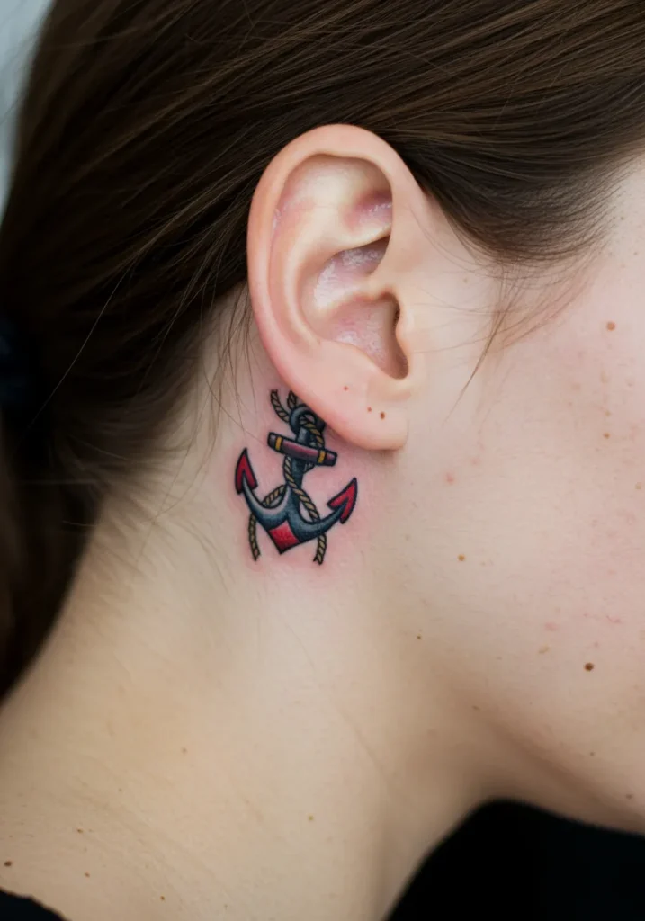 This small anchor tattoo is tucked neatly behind the ear, making it both subtle and stylish. Done in classic black and red ink with fine rope detailing, it’s small enough to stay delicate but bold enough to stand out. It’s perfectly placed for those who love tiny tattoos that still carry meaning.