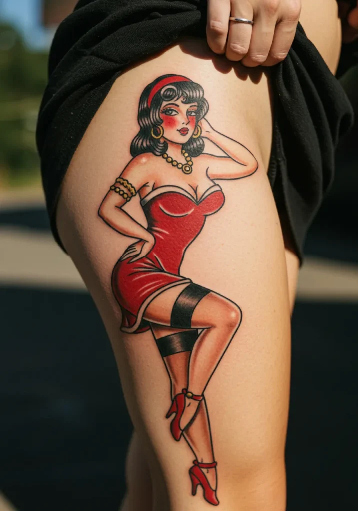 This large thigh tattoo showcases a retro pin-up girl in a red dress and heels, with soft shading and playful details that make her pop. Her confident pose and bold colors capture that classic 1950s vibe perfectly. The placement on the thigh gives it a cheeky yet elegant appeal.
