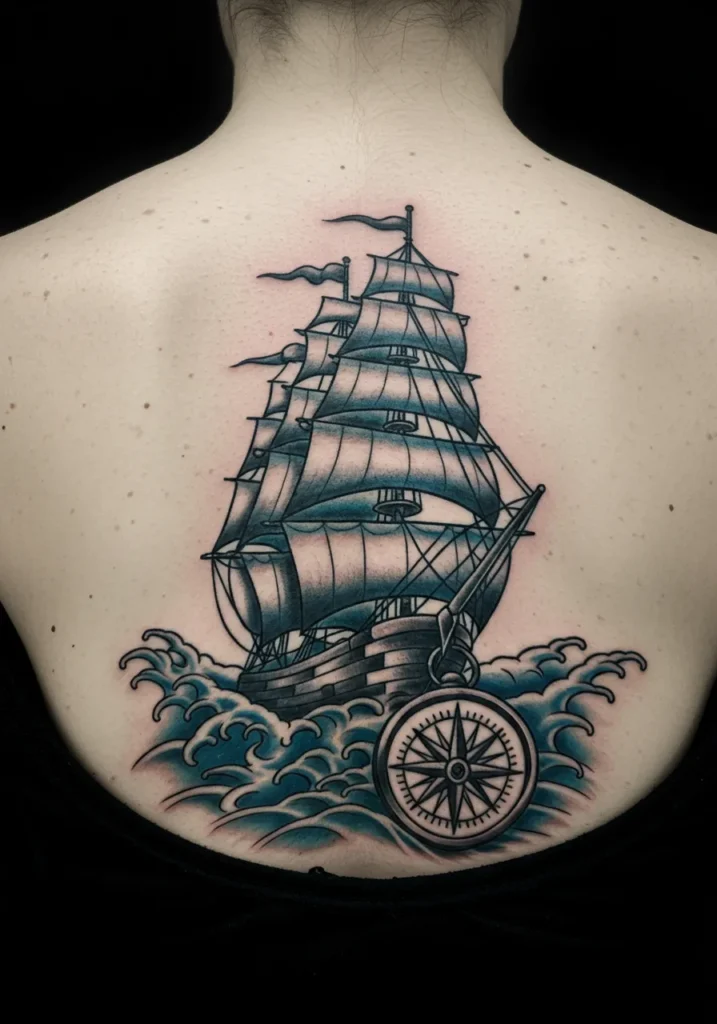 Placed across the upper back, this tattoo features a tall ship in motion, its sails filled with wind and framed by rolling waves below. The artist used muted shades of blue and gray to create depth, with black outlines anchoring it in that strong American Traditional look. A detailed compass sits beneath, tying everything together with meaning and movement.