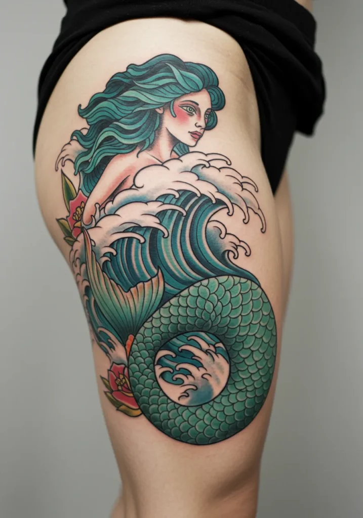 This mesmerizing thigh tattoo shows a stunning mermaid surrounded by rolling ocean waves. The piece is large and full of movement, with sea-green scales, teal hair, and a beautiful mix of blues and pinks that give it a dreamy, oceanic vibe. The traditional bold outlines keep it classic, while the color gradients bring a softer, more feminine edge.