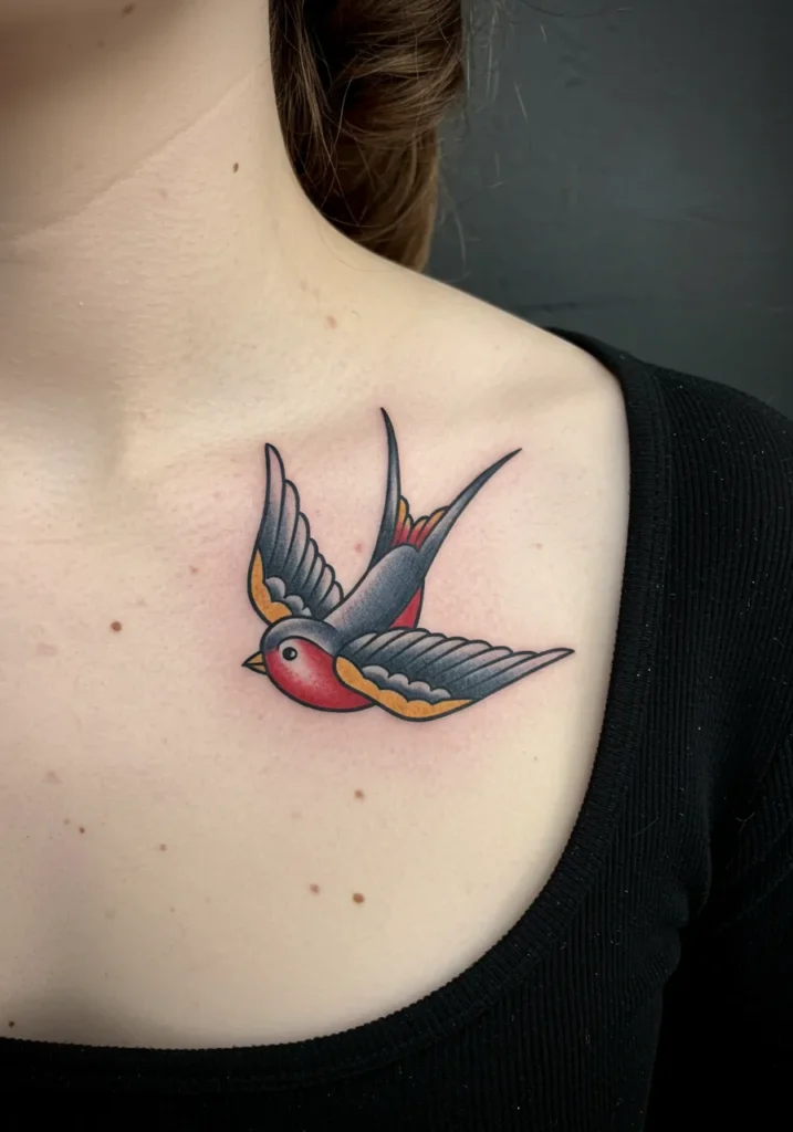 This small American traditional tattoo sits delicately near the collarbone, showing a swallow mid-flight. Its navy-blue wings and red chest are outlined in crisp black with subtle yellow highlights that give it that nostalgic old-school charm. The simple yet striking design flows perfectly with the natural curves of the body.