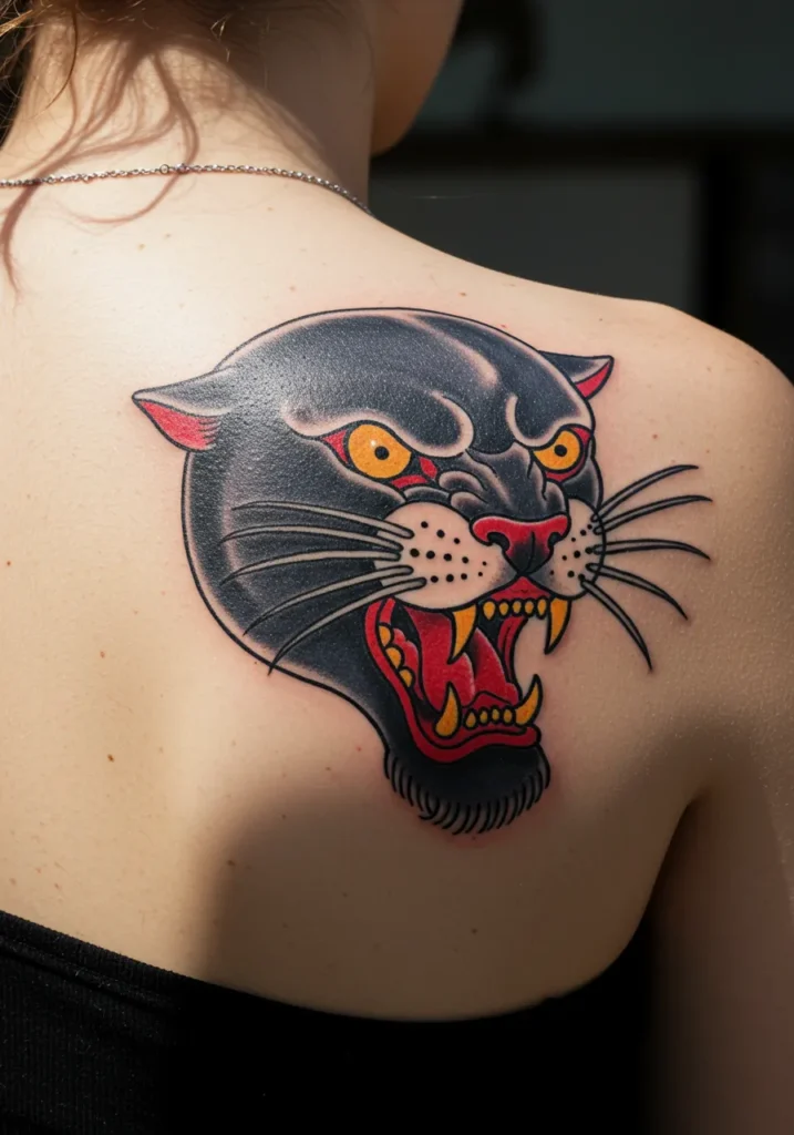 This bold back tattoo showcases a fierce black panther head with piercing yellow eyes and sharp white teeth. The design features thick black shading and vivid pops of red around the mouth and ears. It’s positioned perfectly on the shoulder blade, giving it an empowering presence that commands attention.