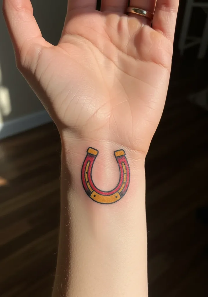 This cute little wrist tattoo features a simple yet charming horseshoe outlined in bold black with shades of red and gold. Its small size and clean lines make it ideal for a minimal but meaningful piece. The placement catches the light beautifully, giving it that playful and lucky vibe.