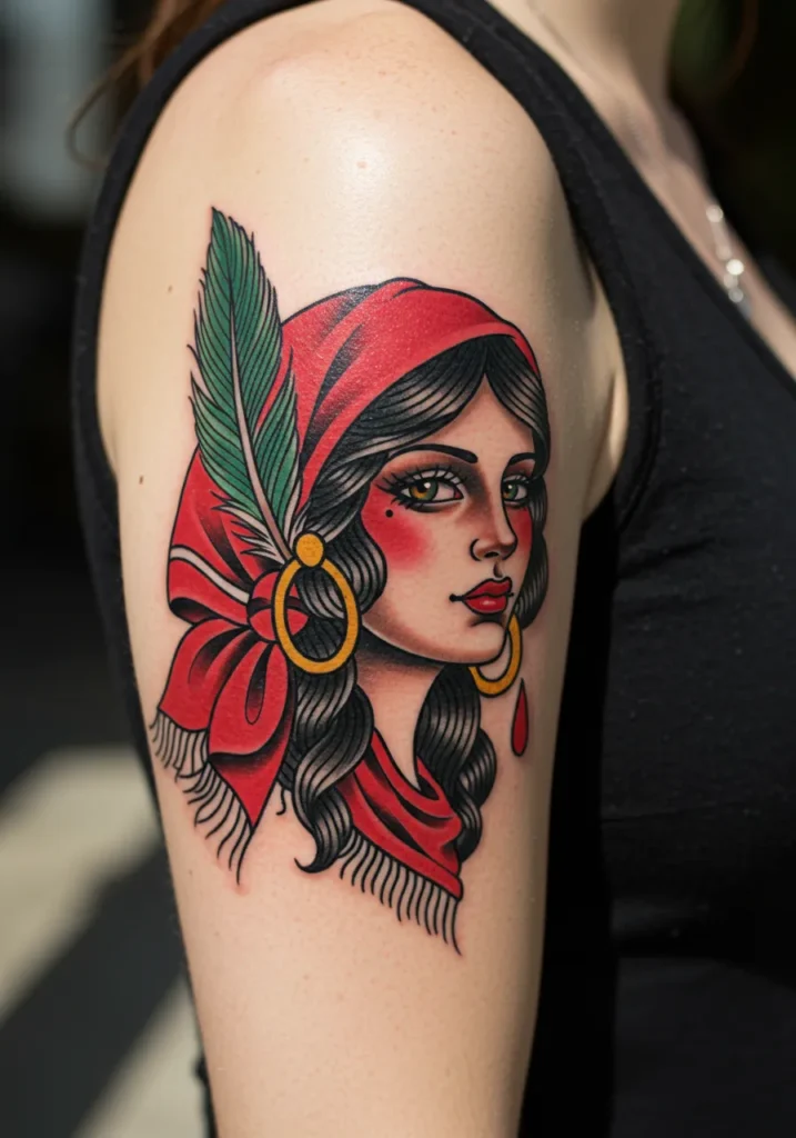 This vibrant upper arm tattoo features a classic lady head, complete with flowing dark hair, golden hoop earrings, and a red bandana adorned with a green feather. The strong lines and saturated colors give it that unmistakable American traditional look while the soft shading adds feminine grace.