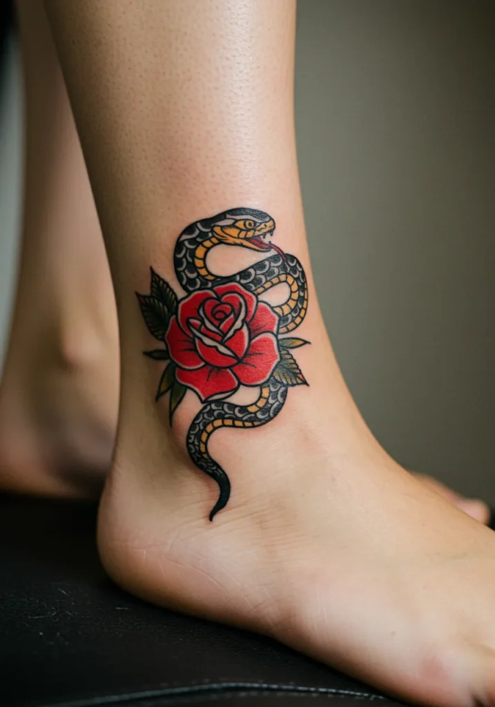 This ankle tattoo pairs a bold red rose with a coiled black and gold snake, creating a dramatic yet elegant look. The fine detailing of the scales contrasts beautifully with the soft shading of the rose petals. It’s compact but full of character, wrapping around the ankle just enough to feel balanced and eye-catching.