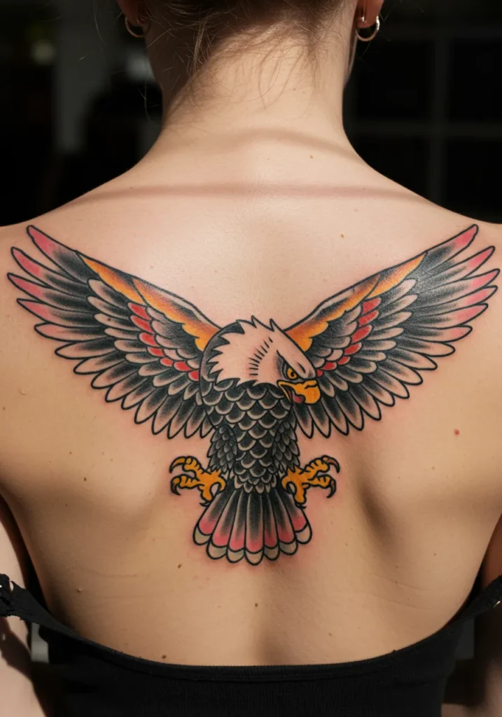 I think this one feels like pure freedom. There’s something empowering about having such a strong symbol on your back — like a reminder to always rise above challenges. It’s confident, timeless, and absolutely stunning in American Traditional style.