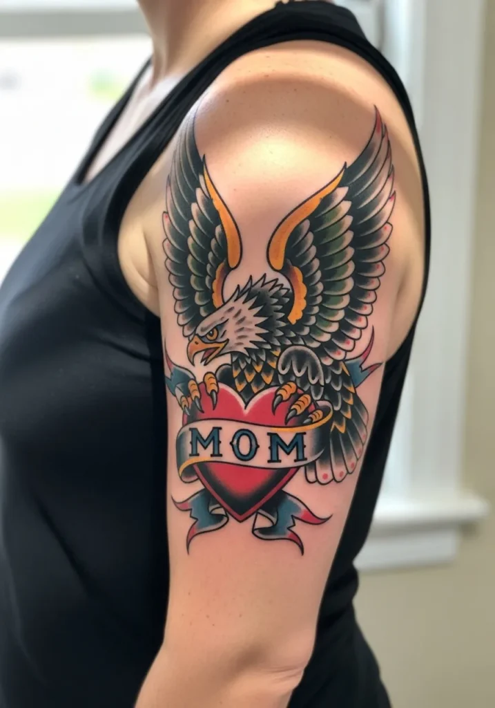 This classic upper arm tattoo features a fierce American eagle spreading its wings above a bright red heart with a banner reading “MOM.” The old school style is unmistakable with bold black outlines, thick shading, and a rich color palette of reds, yellows, and blues. The design fits perfectly on the shoulder and upper arm, showing clean linework and timeless charm.