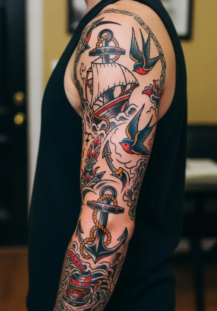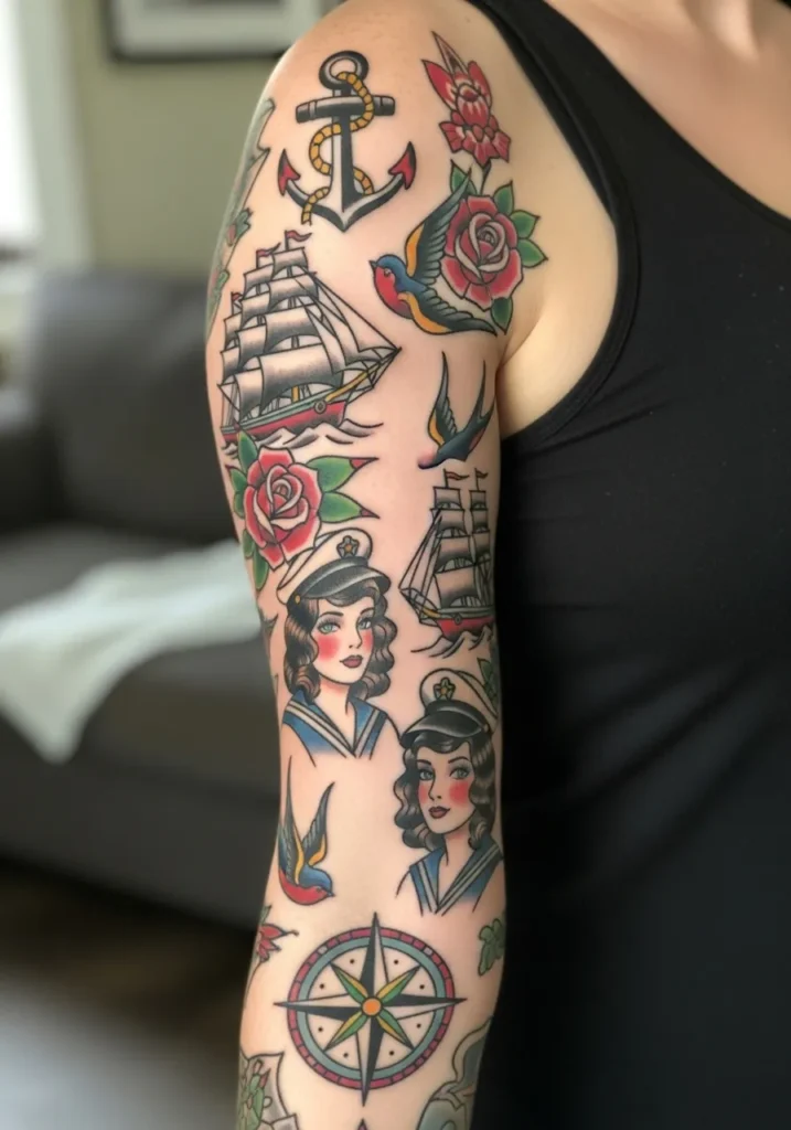 This arm tattoo brings together all the best nautical motifs—ships, anchors, roses, swallows, and two classic sailor girls. The colors are bright and balanced, using reds, blues, and yellows to capture that perfect Americana tattoo charm.