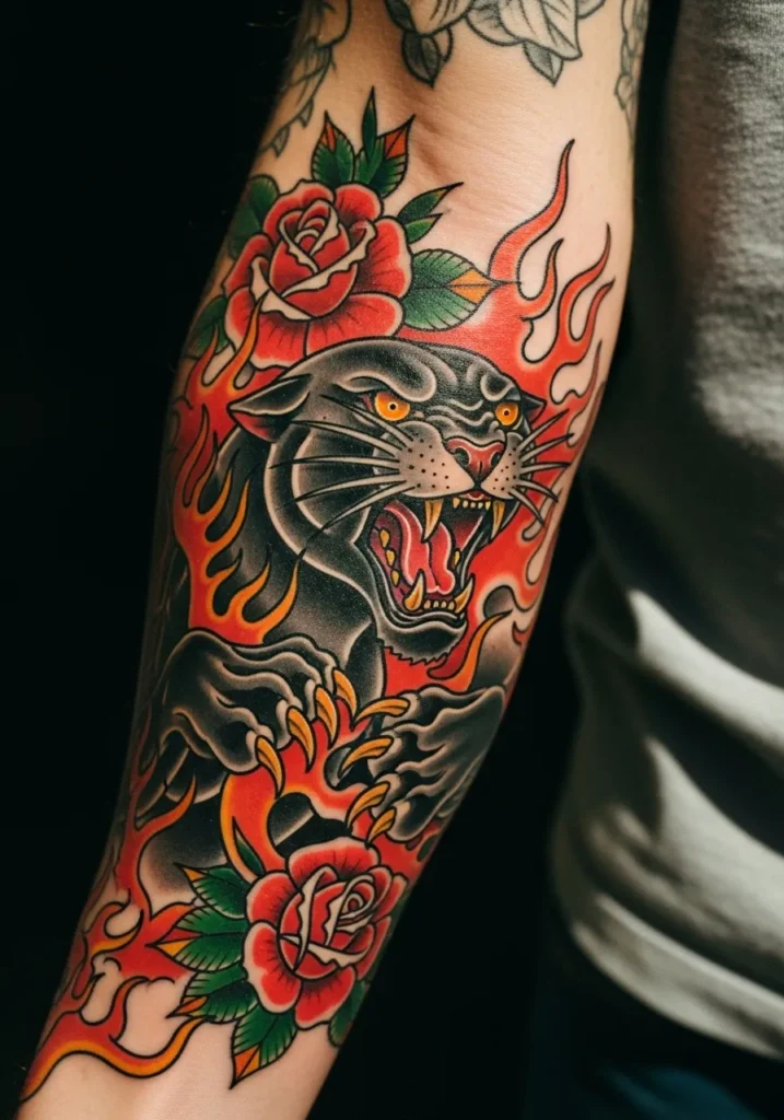 This fiery sleeve design features a roaring black panther surrounded by flames and red roses. The color contrast between the warm reds and the dark fur makes the panther almost leap off the skin. It’s bold, saturated, and full of life.